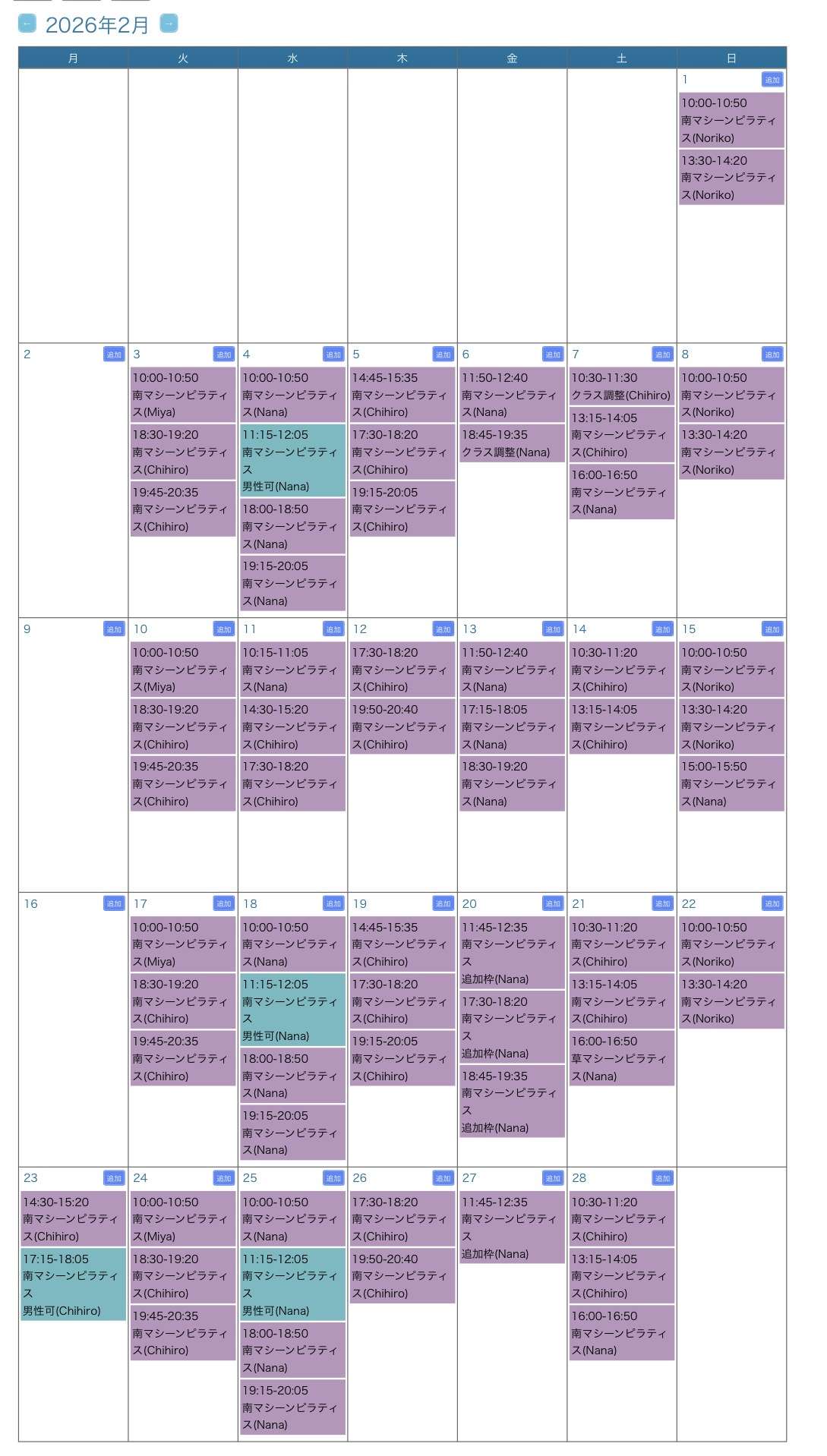 マシーンピラティスレッスンスケジュール Lesson schedule