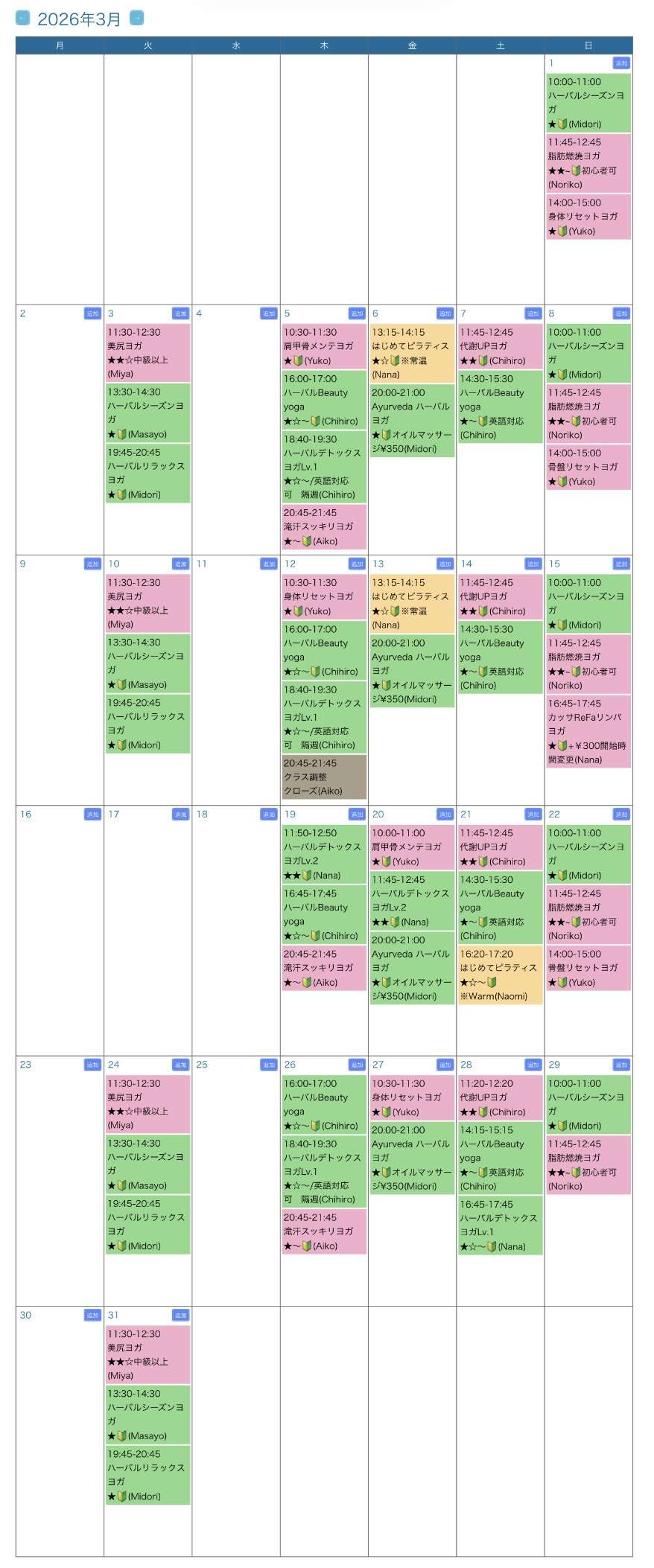 (重要)ホットヨガクラス※スタッフの都合(体調)により、担当変更・休校となる場合があります。2時間前に予約の無いクラスは、締切設定で予約不可となりますので、お早めにご予約下さい。Webと実際の予約サイトのクラス時間や担当が変更となる事があります。ご来店時に、再度ご確認をお願い致します。※クリックすると拡大表示になります。